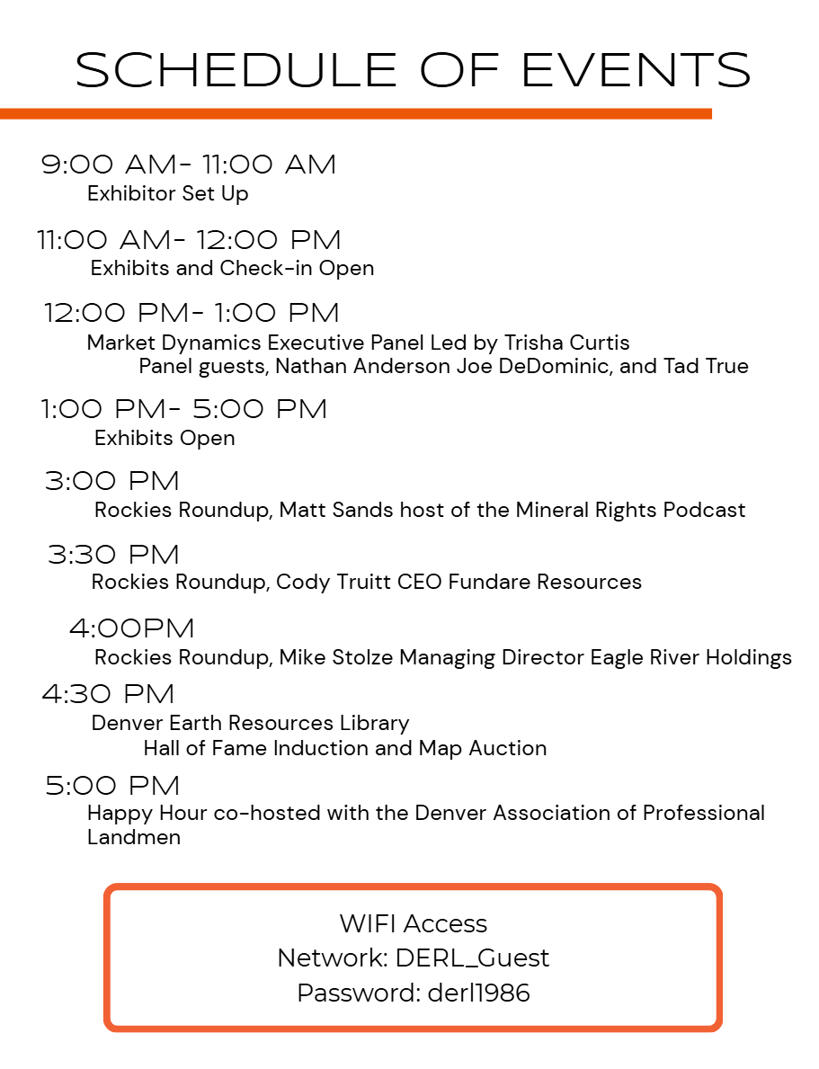 The Rocky Mountain Prospect Expo is the Denver Earth Resources Library’s flagship event, bringing together operators, deal makers, mineral owners, and industry leaders to share insights, explore opportunities, and build connections. This year’s program will feature a lunch session on current market dynamics, focused talks on deal flow, development trends, and mineral ownership, and plenty of time to network- including a joint happy hour held with the Denver Association of Professional Landmen.